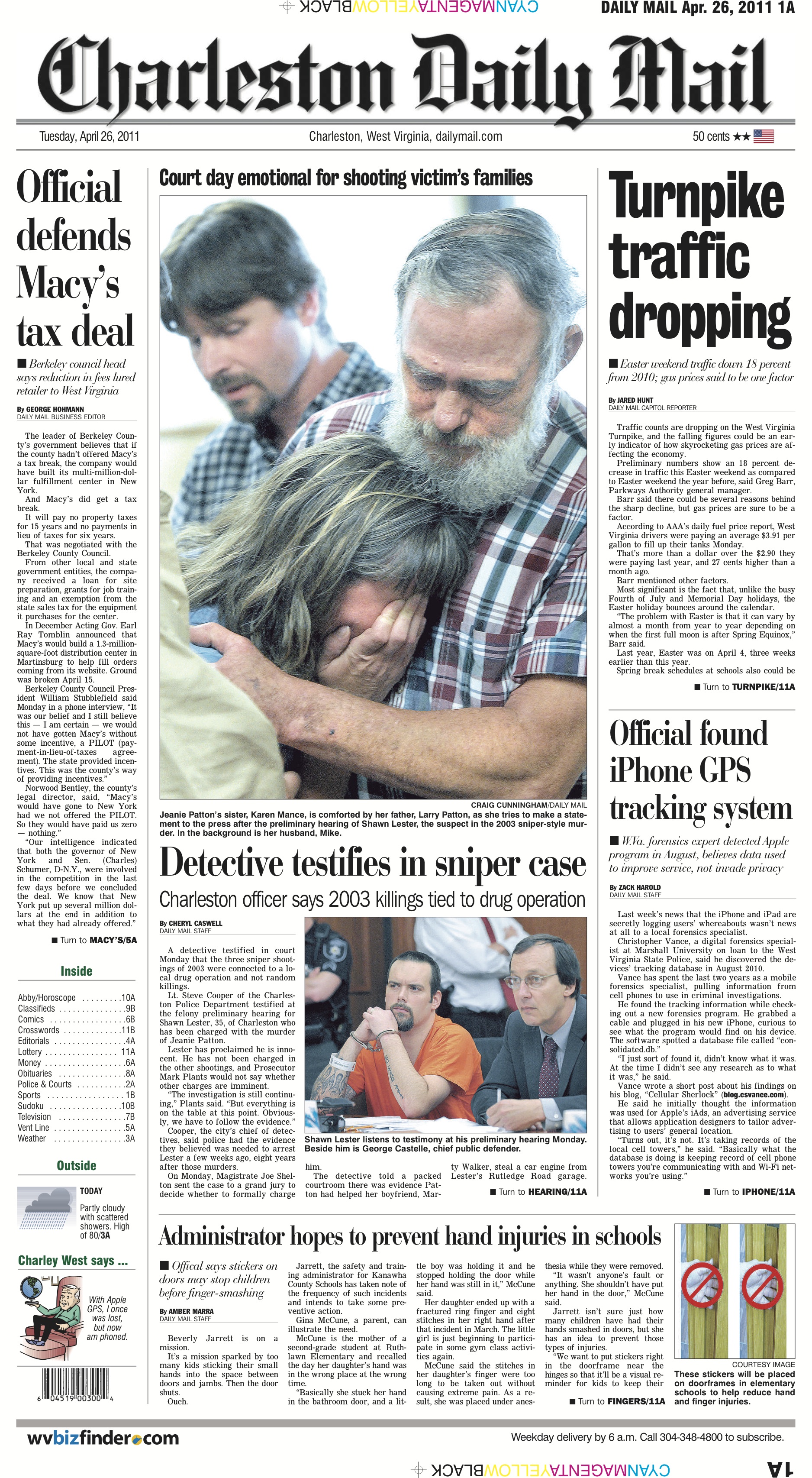 - This front page was selected by Newseum as one its top 10 front pages on April 26, 2011.